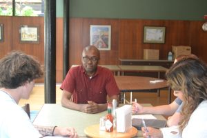 Students interview Fr. Dudley Pierre in the Province Center dining room.