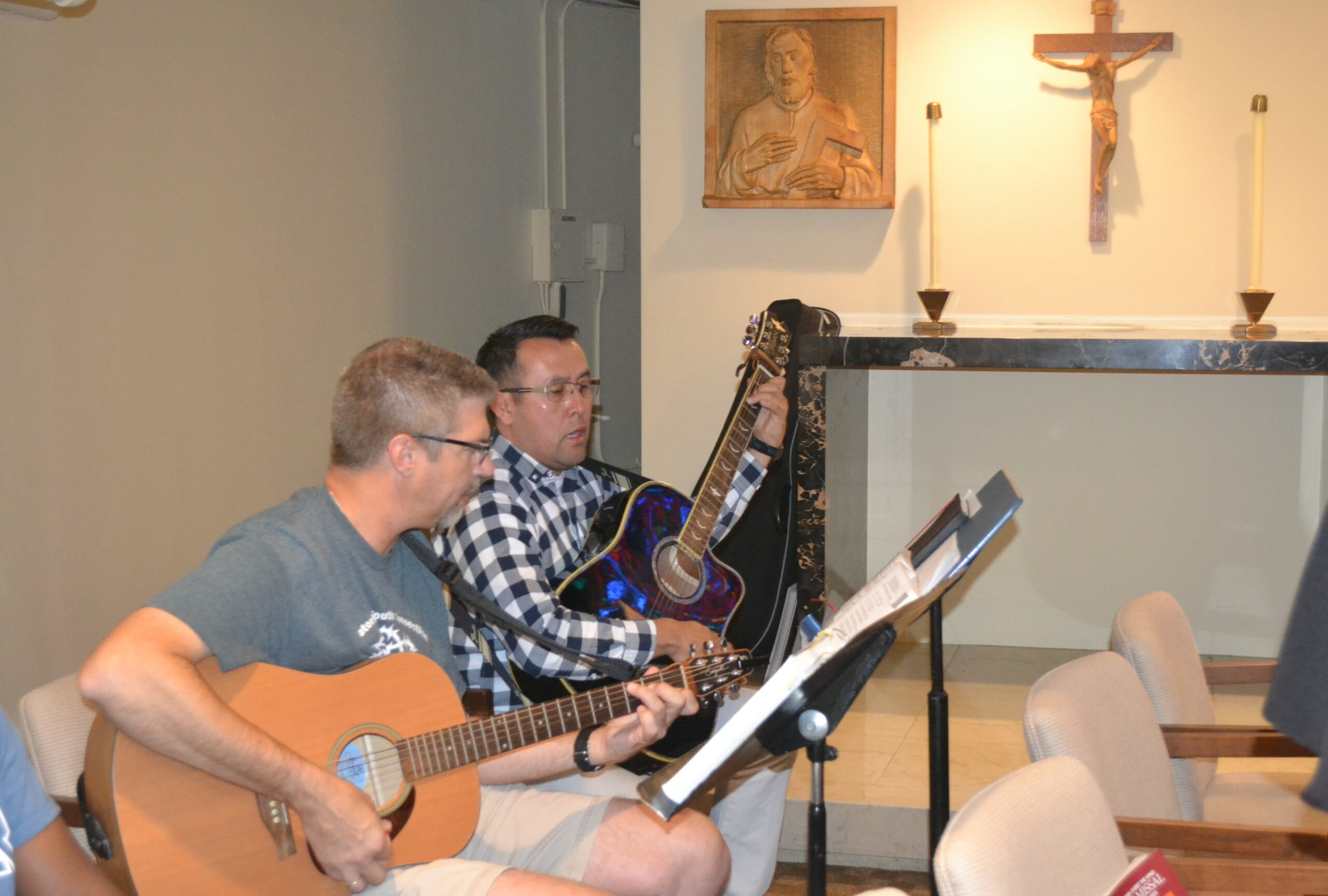 Br. John Eustice and Br. Jhobany, both seminarians, joyfully add music to the Mass.