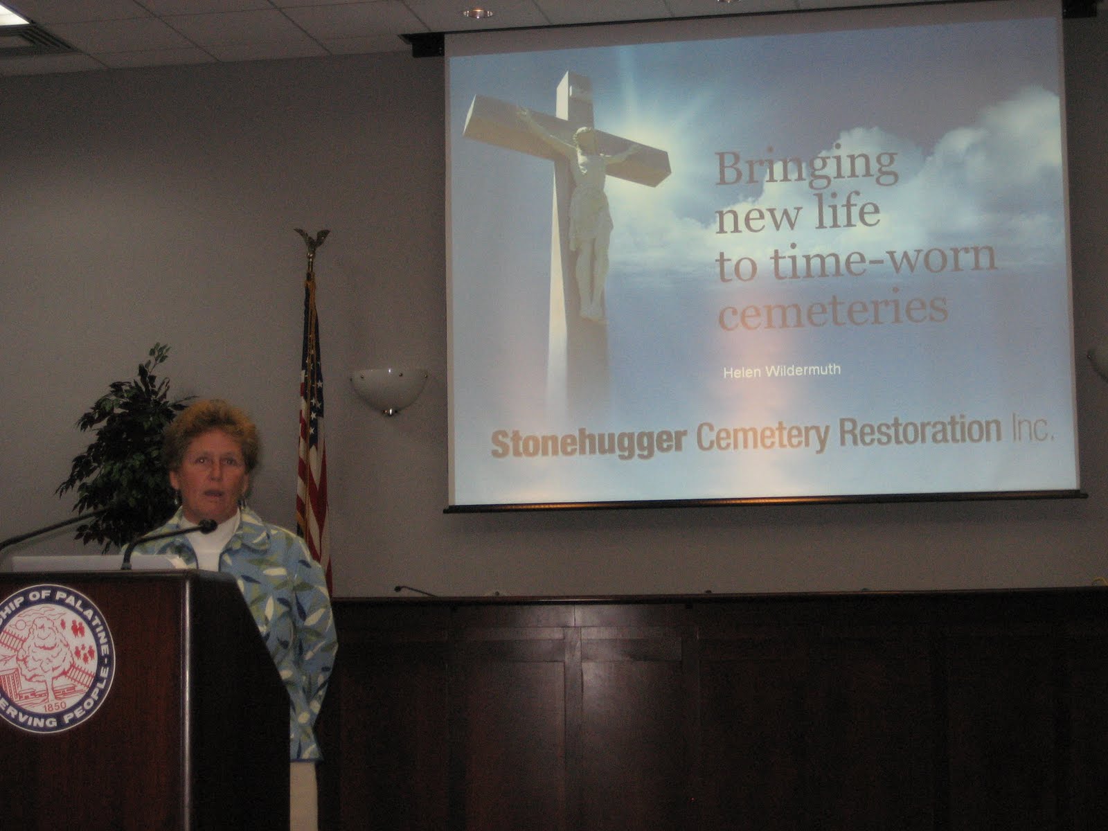 Helen Wildermuth from Stonehugger Cemetery Restoration, located in Nashville, Indiana gave the presentation. Over her 17 year career, she has restored more than 15,000 stones of all sizes and types. She is an advocate for educating communities about the care of their cemeteries.