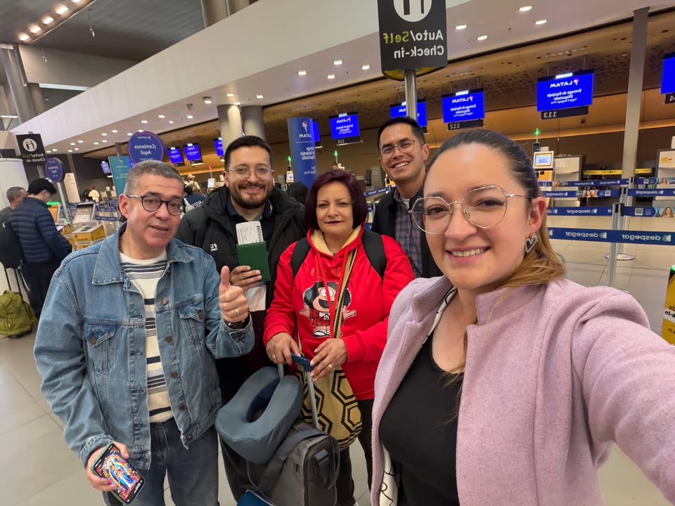 Julián (second from left) flew to Chile last week after one last farewell at the airport from members of his family and Fr. Juan Carlos (second from right).