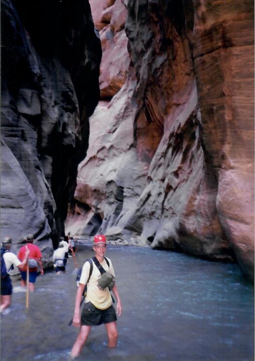 Fr. John hiking the narrows at Zion National Park with his Scouting troop.