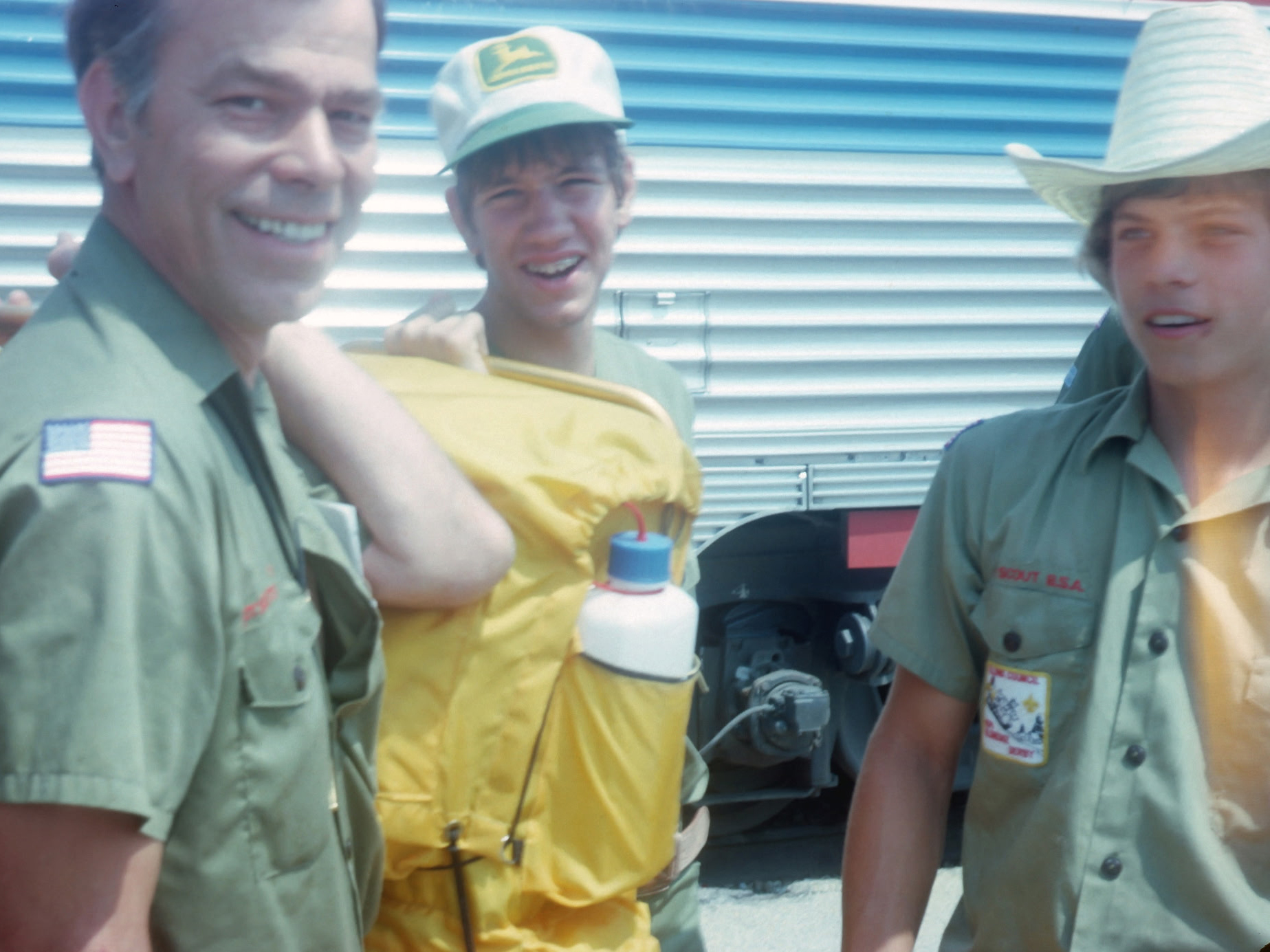 Bishop Glancy (middle) with a friend and adult leader, loading up for an Amtrak ride to a Scouting adventure.