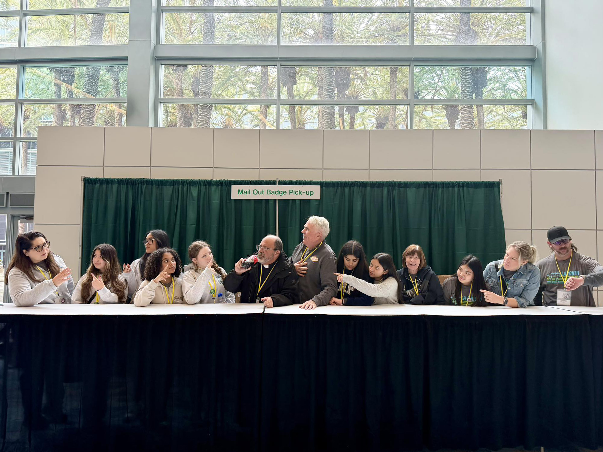 Fr. Dan (center) poses for a little Last Supper scene at LA Youth Day in 2026 with the group from St. Viator Catholic Community.