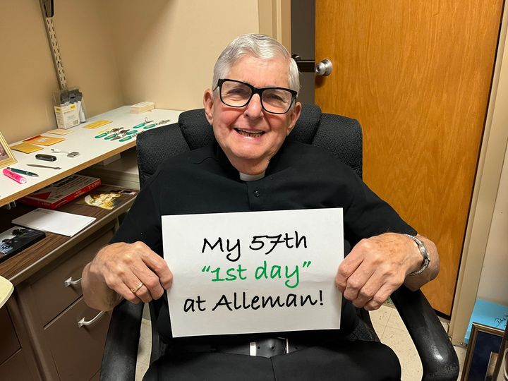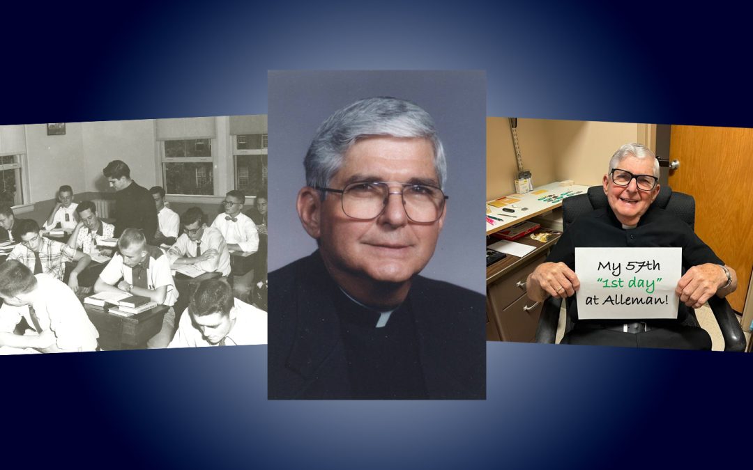 Remarkably, after Fr. Daniel arrived at Alleman, he never moved again. He served as a history and sociology teacher, business manager, booster club moderator, bookstore manager, development director, and chaplain during an astounding 57-year stint – and even after retiring in 2023, he remained in the area and present to friends in the Alleman community.