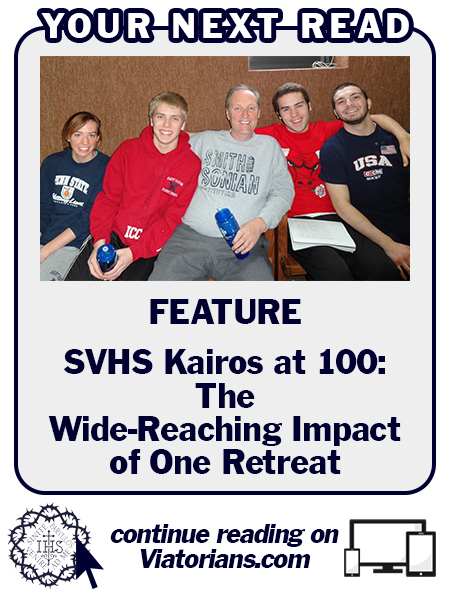 SVHS Chaplain Fr. John Eustice, CSV, directed the retreat, and Cathy coordinated much of the logistics. They were delighted to partner with Coordinator of Viatorian Youth Ministry Amanda Fierce, who ministers in both parishes, and St. George staff member Amy McCrary to bring these four young people into the Kairos fold. “Teaming up was a no-brainer. It was so easy to welcome them and incorporate them fully into our retreat. It felt really seamless,” Fr. John said. “Faith development that’s hosted at Saint Viator High School isn’t limited to helping just our current students. Our Viatorian mission spreads and tries to build the Kingdom however is needed.”