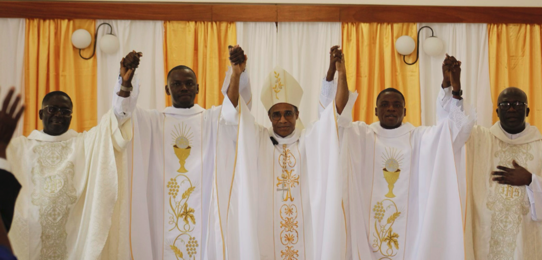 Left to right, Fr. Nestor, Fr. Claudy, Bishop Jean, Fr. Jean-Éric, and Fr. Wilford Douze, CSV, Regional Superior of Haiti